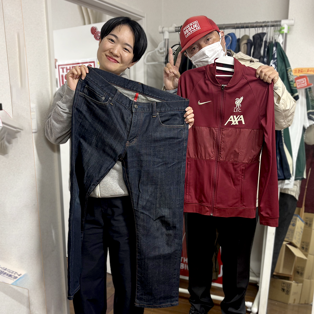 基金では、寄付でいただいた男性用衣料を、事務所に訪れる相談者や路上で雑誌販売をするホームレス当事者に提供しています。